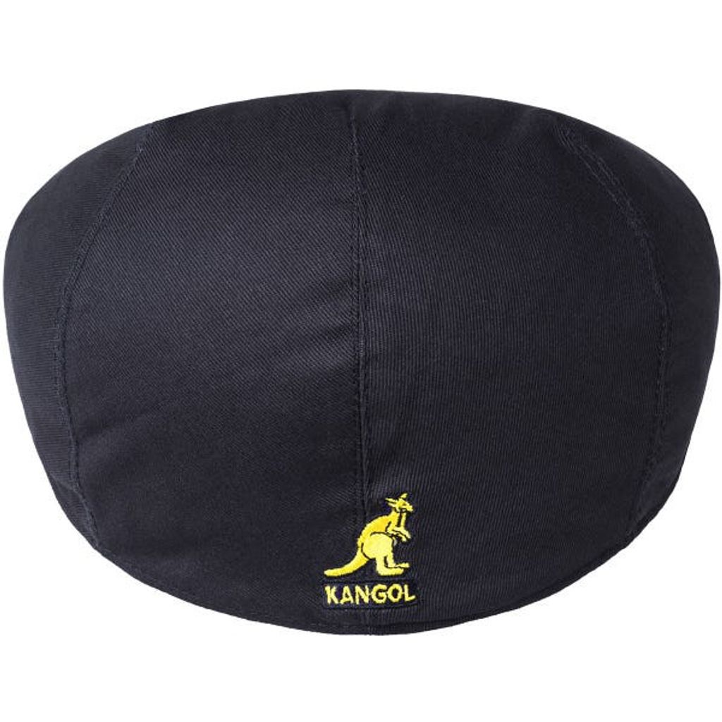 En mörkblå gubbkeps/ flat cap från Kangol. Gul Kangol logo i brodyr baktill.