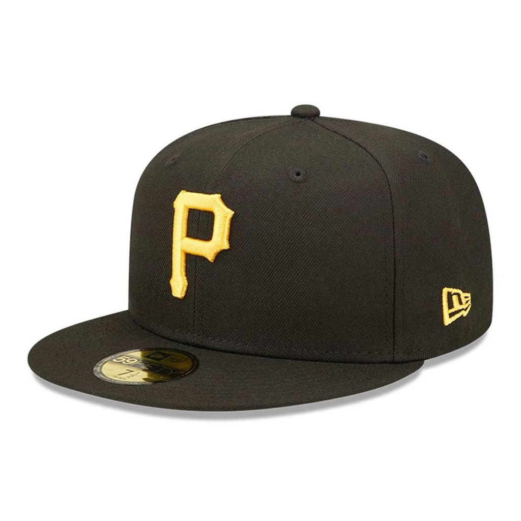 Svart 59FIFTY från New Era med broderad Pittsburgh Pirates-logga. En fitted keps med fast storlek och platt skärm.