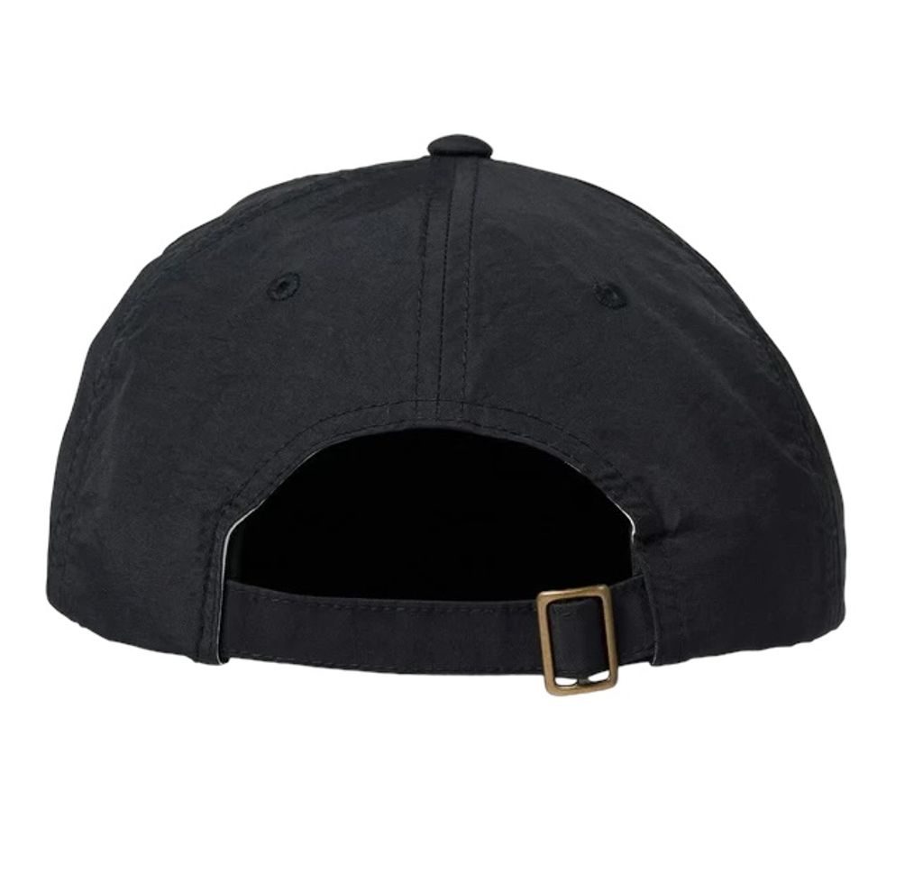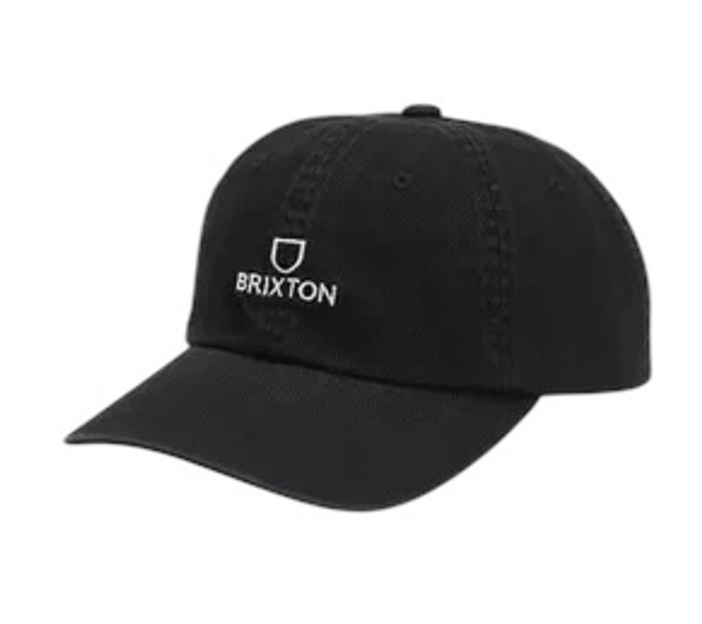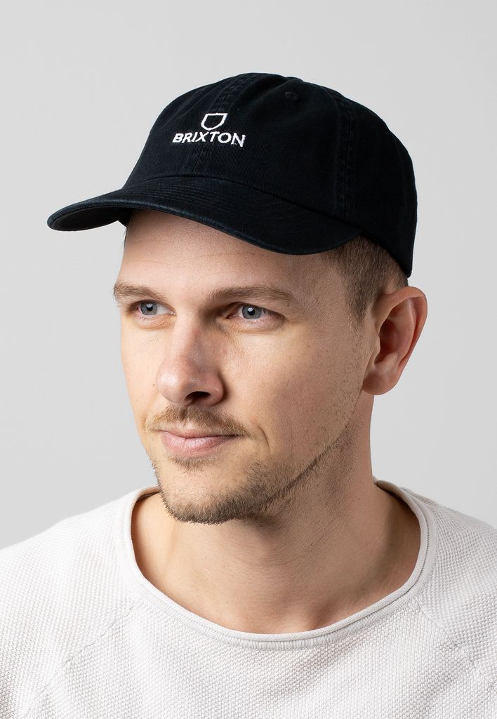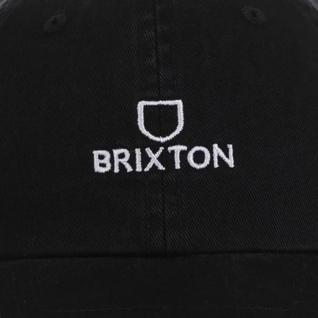 Svart dad cap från Brixton med tvättad look, vit brodyr. Reglerbart spänne baktill.