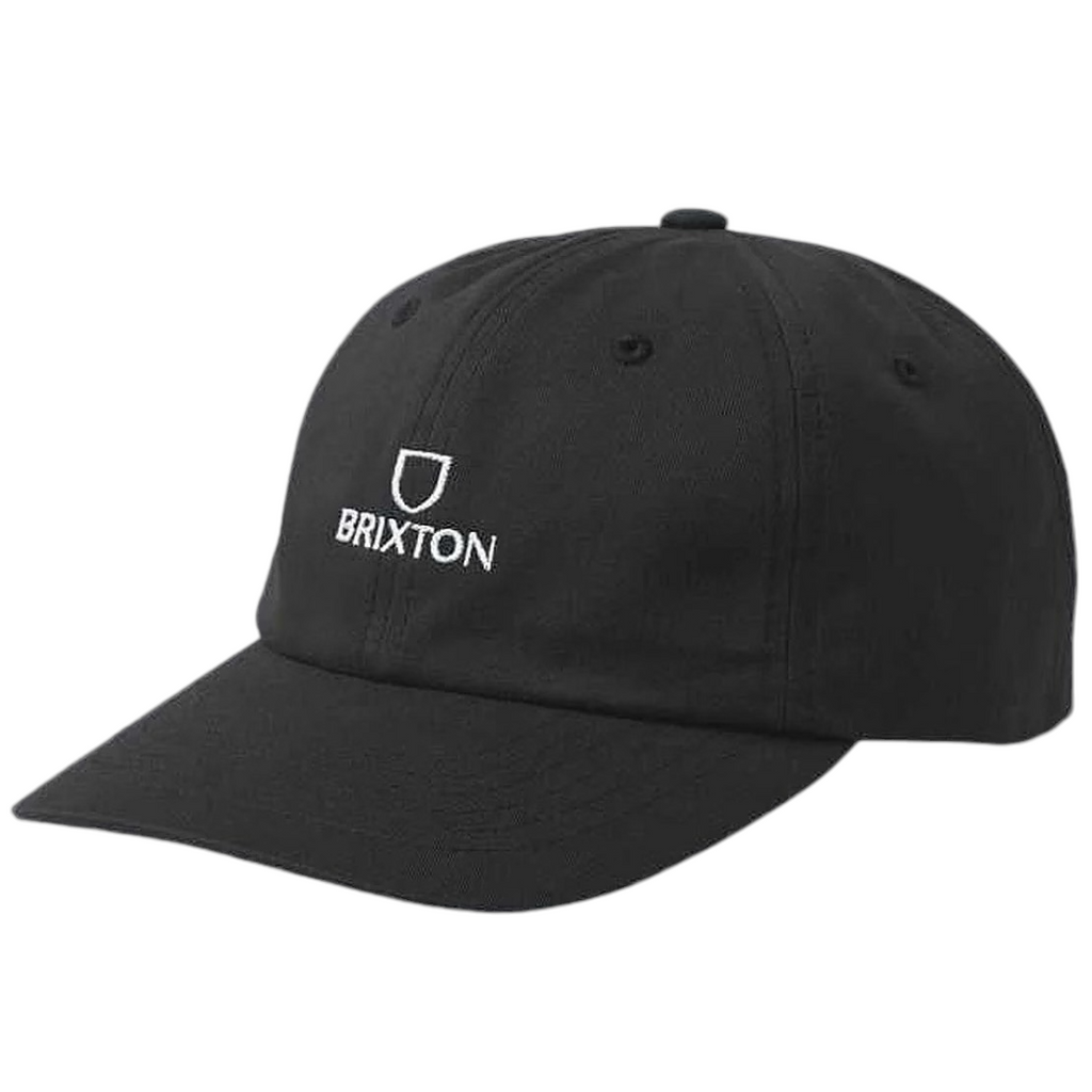 Svart dad cap från Brixton, vit brodyr. Skärmen är tillverkad av återvunnet fisknät. Reglerbart spänne baktill.