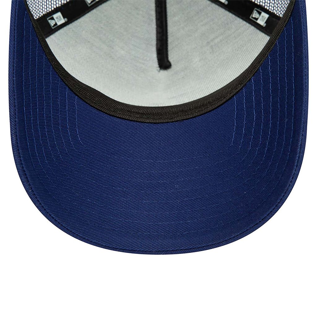 En blå trucker i A-frame modell Los Angeles Dodgers logo i brodyr framtill och New Era flagga på sidan. Reglerbart spänne baktill.