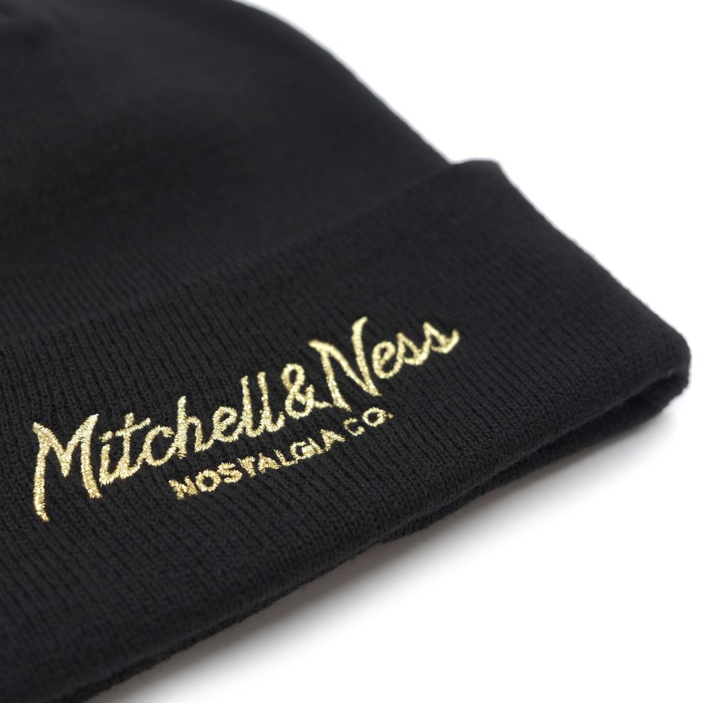 Stickad mössa från Mitchell & Ness i svart med uppvikt kant och broderad Pinscript-logotyp i guld. Klassisk modell med tidlös stil.