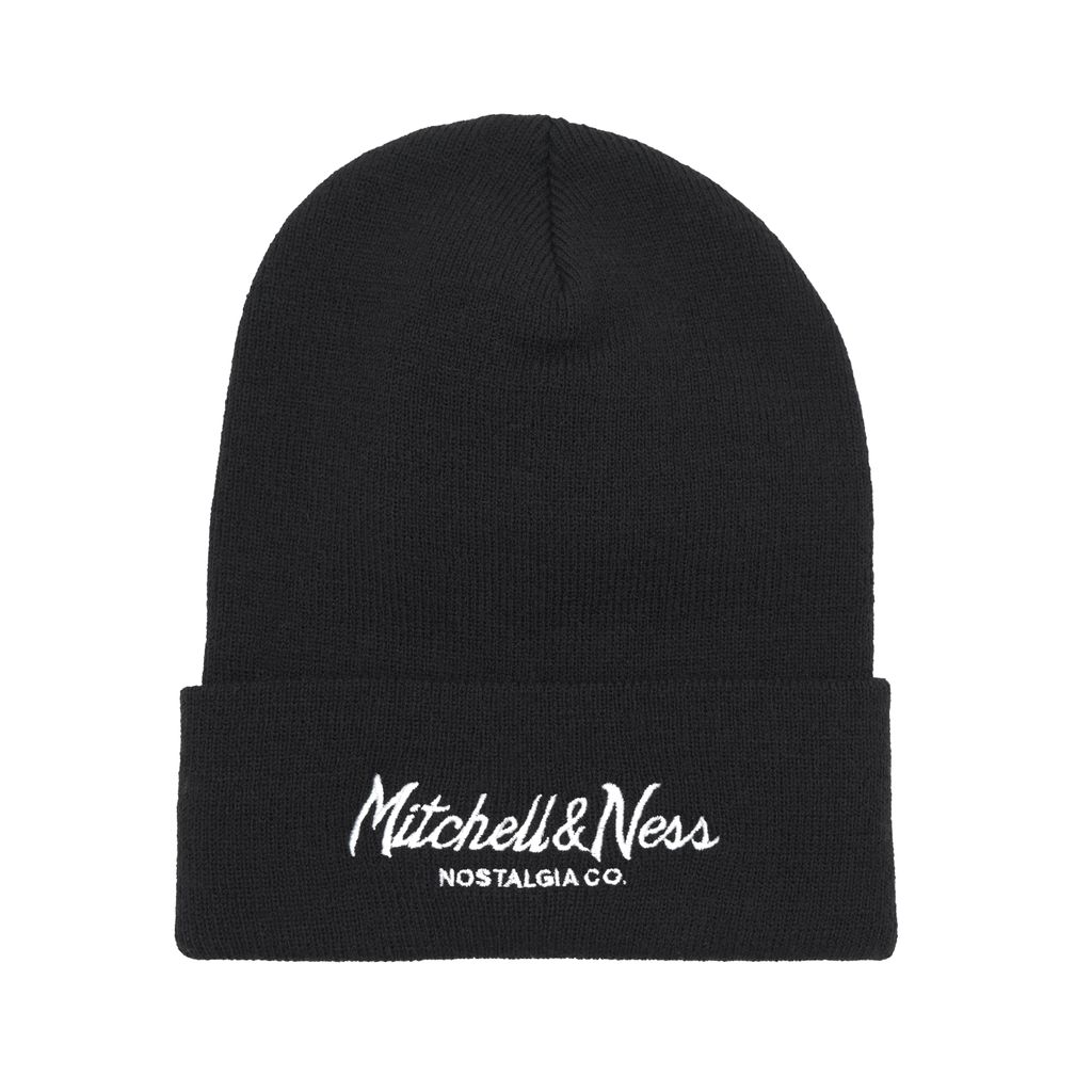 Stickad mössa från Mitchell & Ness i svart med uppvikt kant och broderad Pinscript-logotyp i vitt. Klassisk och lättmatchad modell.