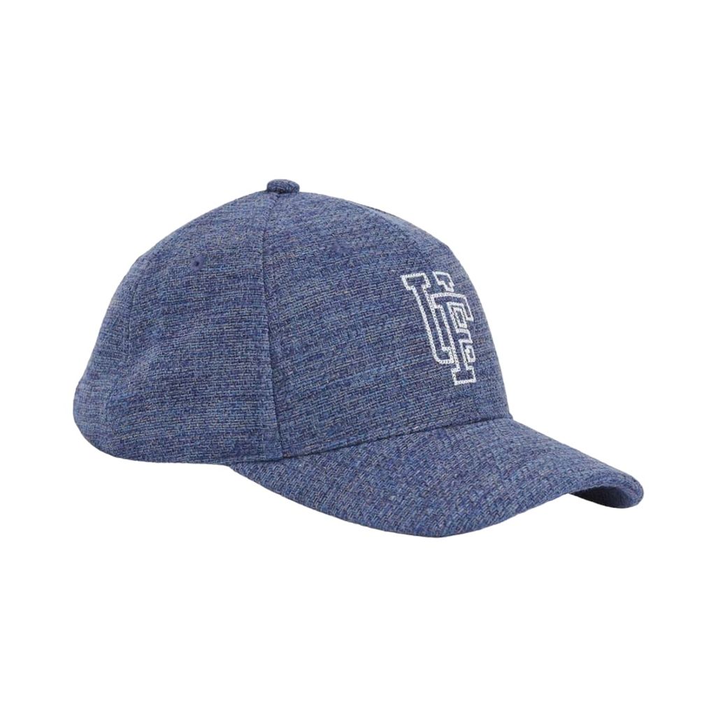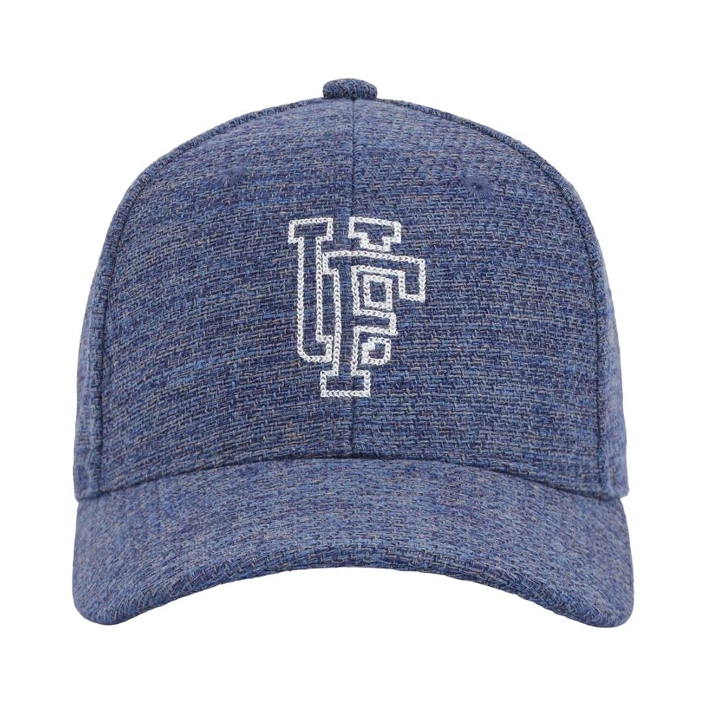 Blåmelerad keps i återvunnet material med Upfront logo i brodyr. Reglerbart spänne baktill.