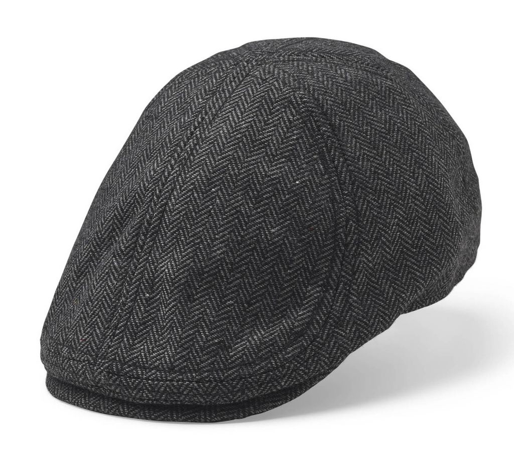 En stilren Statewear duckbill flat cap i svart/grå fiskbensstruktur. Avsmalnande form, mjuk passform och tidlös karaktär som passar året runt.
