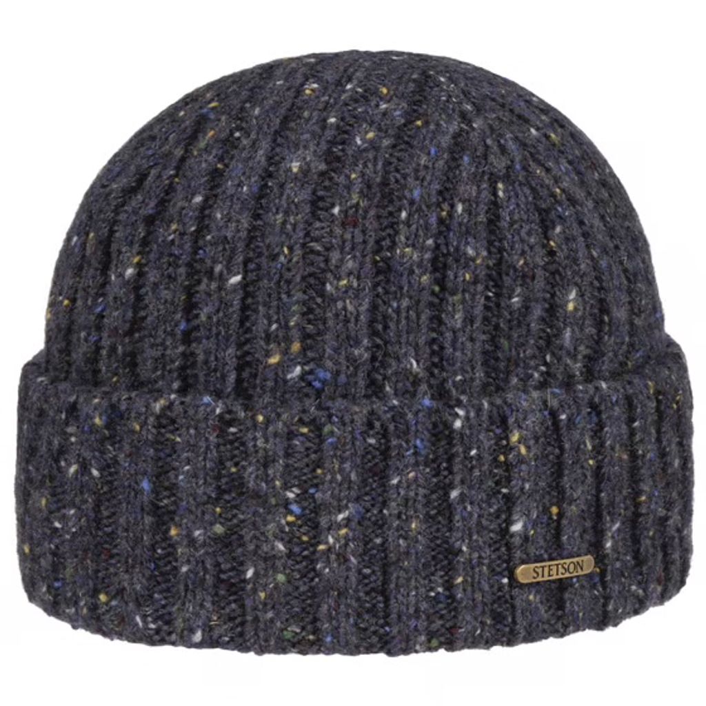 Donegal Beanie Hat Blue with Cuff - Setson. Denna Stetson mössa är stickad i exklusivt Donegal-garn med grov ribbstruktur och små färginslag som ger ett levande, modernt uttryck. Tack vare den höga ullhalten är mössan både varm och lätt, samtidigt som den skyddar mot kyla och fukt under höst och vinter.