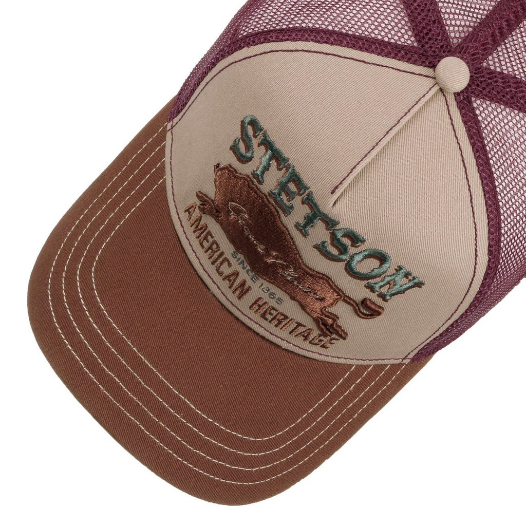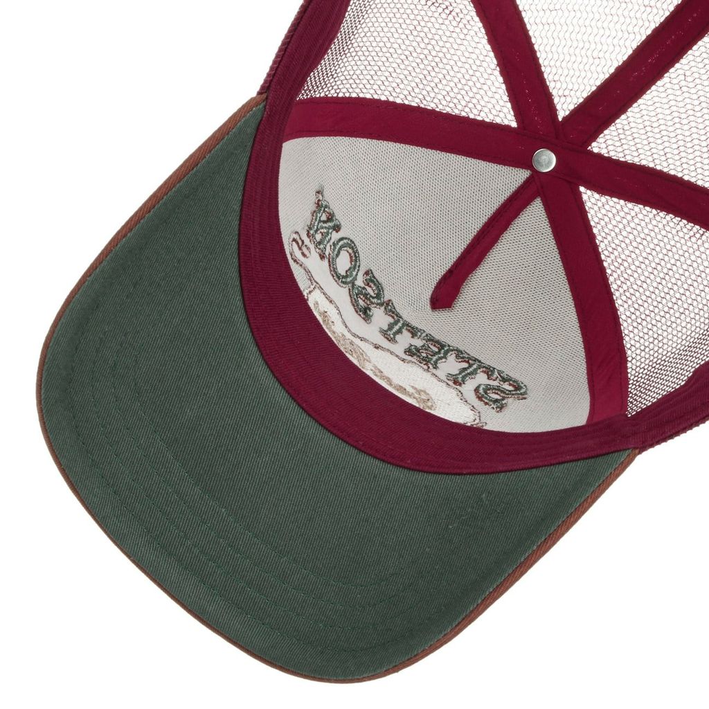 En klassisk Stetson keps i trucker-modell med mesh bak och broderad front. Kombinationen av brun skärm och vinröd mesh ger ett mjukt och balanserat uttryck.