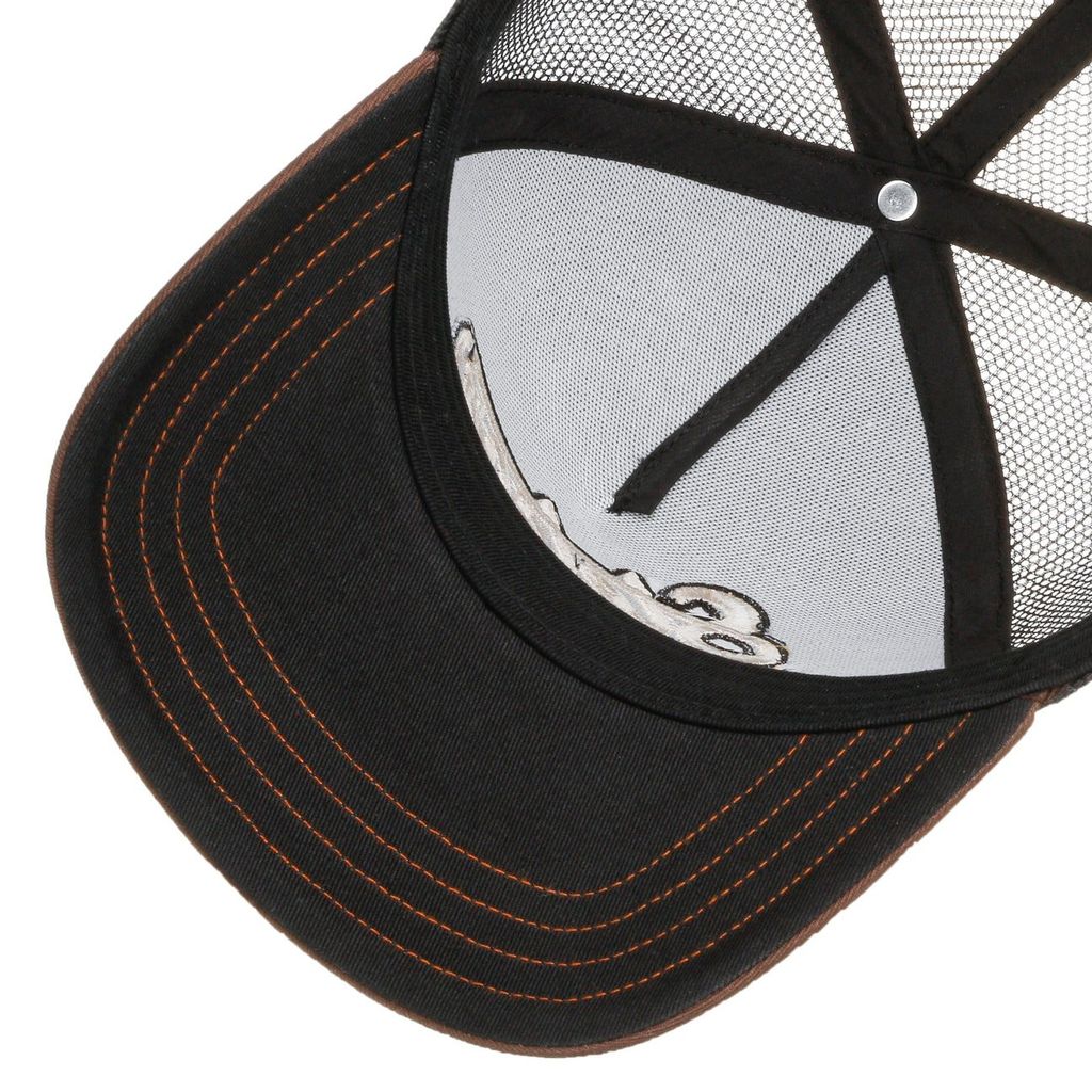 En trucker cap från Stetson i färgerna chestnut och olive med broderad Speed Shop-patch, mesh baktill och justerbar passform.