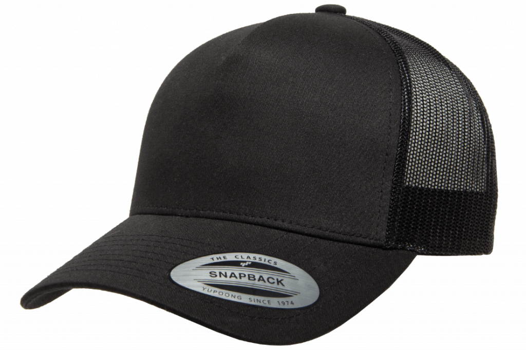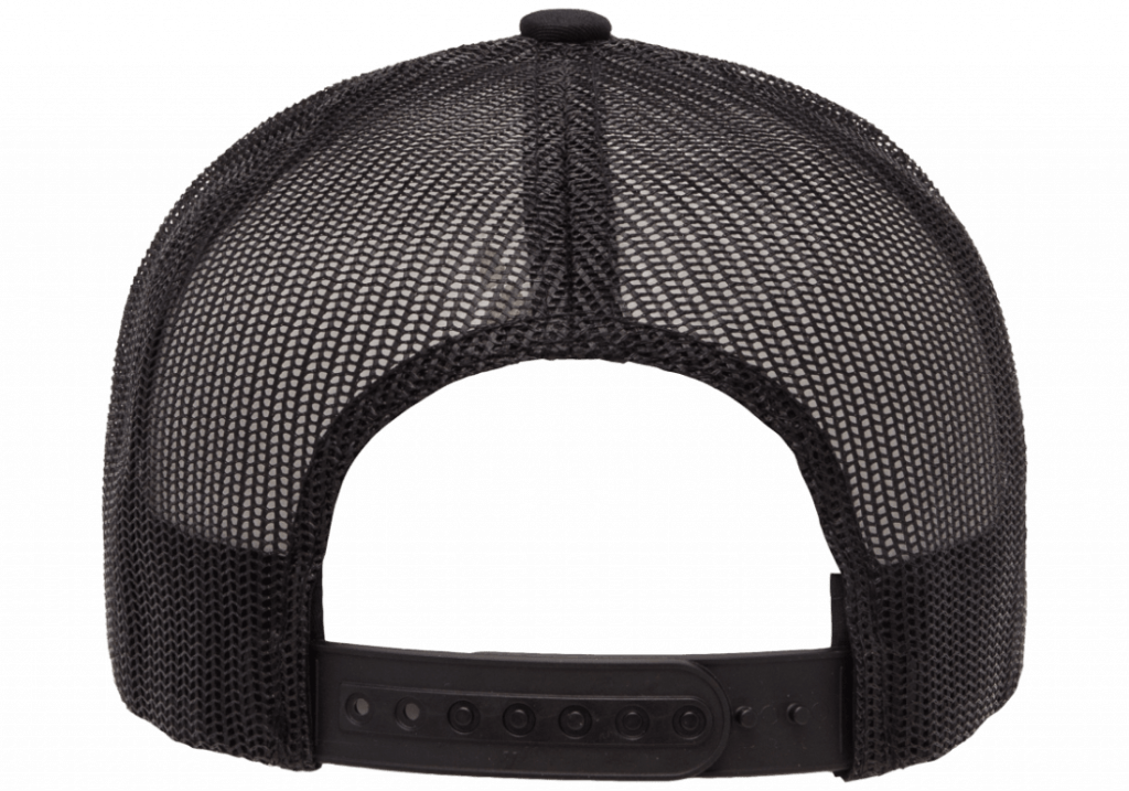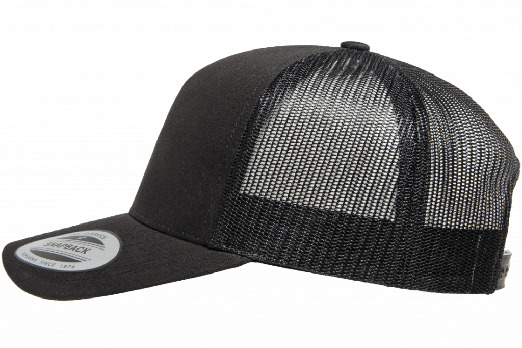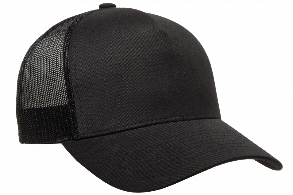 En helsvart trucker utan logos från Yupoong. Reglerbart spänne baktill.