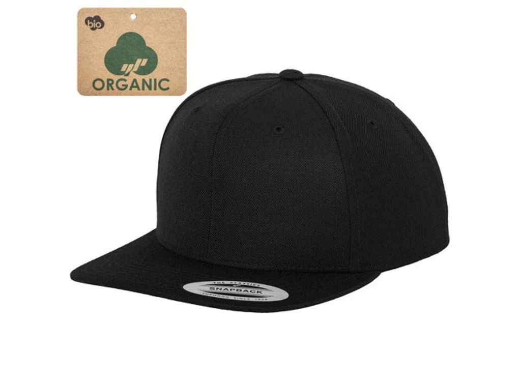 En svart snapback från Yupoong i organiskt bomull. Reglerbart spänne baktill.